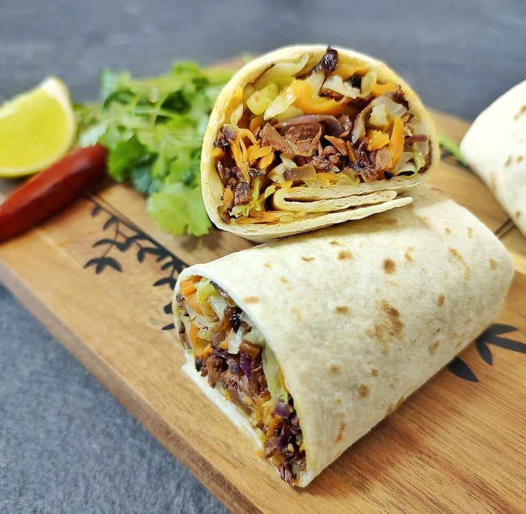 Simbolo dello street food tex-mex, il burrito è una tortilla farcita generalmente con carne e verdure varie. La ricetta che ti propongo oggi è con JACKFRUIT sfilacciato, speziato e saltato in padella con CIPOLLA ROSSA, e VERDURE.