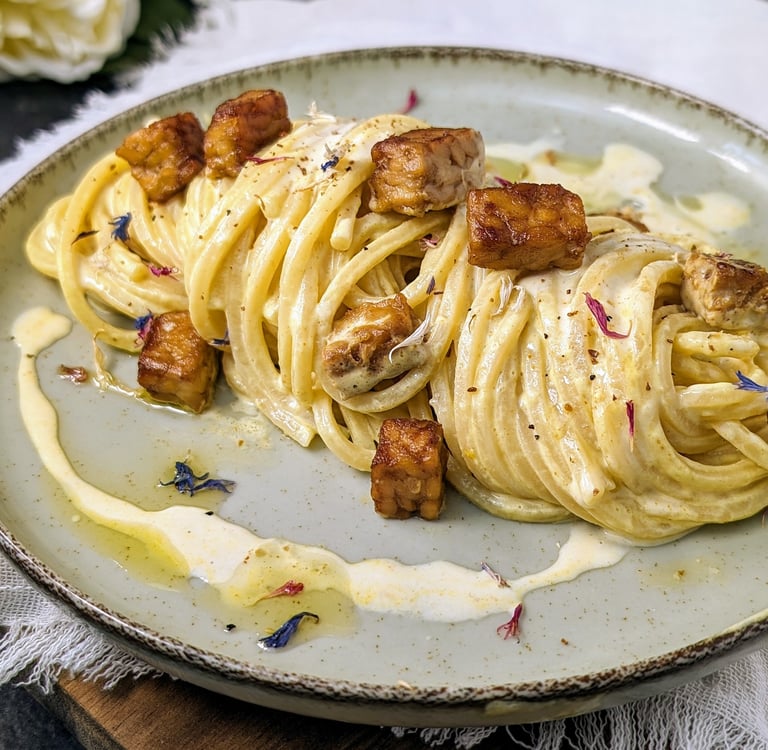 Un tempo non impazzivo per il tempeh ed ero più fan del tofu, ma negli ultimi anni ho iniziato ad amarlo e credo stia divinamente con questa carbonara.