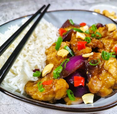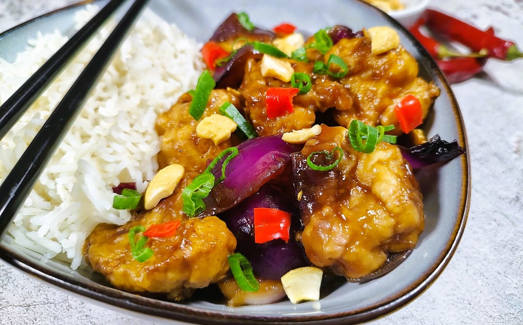 Lasciamo il pollo tranquillo e godiamoci questo piatto saporitissimo sostituendolo con delle cimette di cavolfiore pastellate, fritte e poi fatte saltare in un wok con una deliziosa salsa piccante leggermente agrodolce e insaporite con zenzero e arachidi.