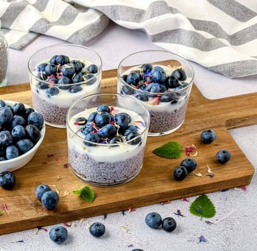 Versa i semi di chia in una ciotola, poi aggiungi il latte vegetale e lo yogurt di soia ai mirtilli.