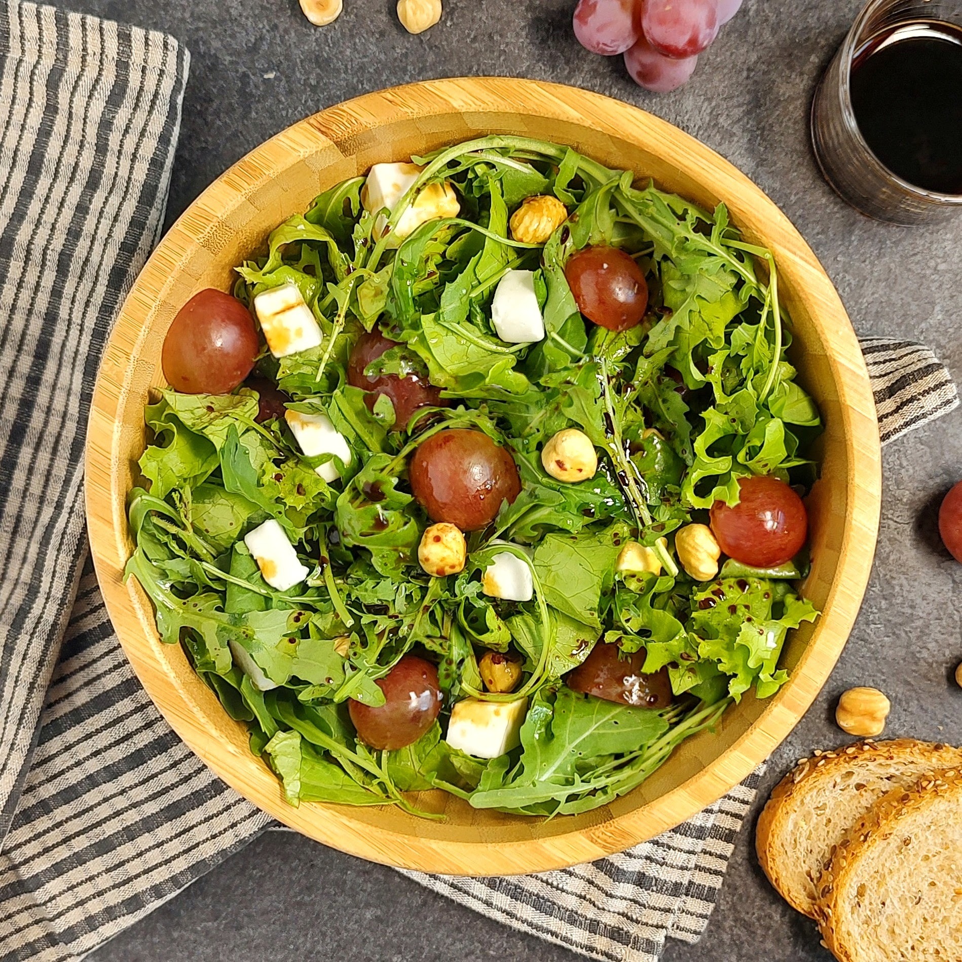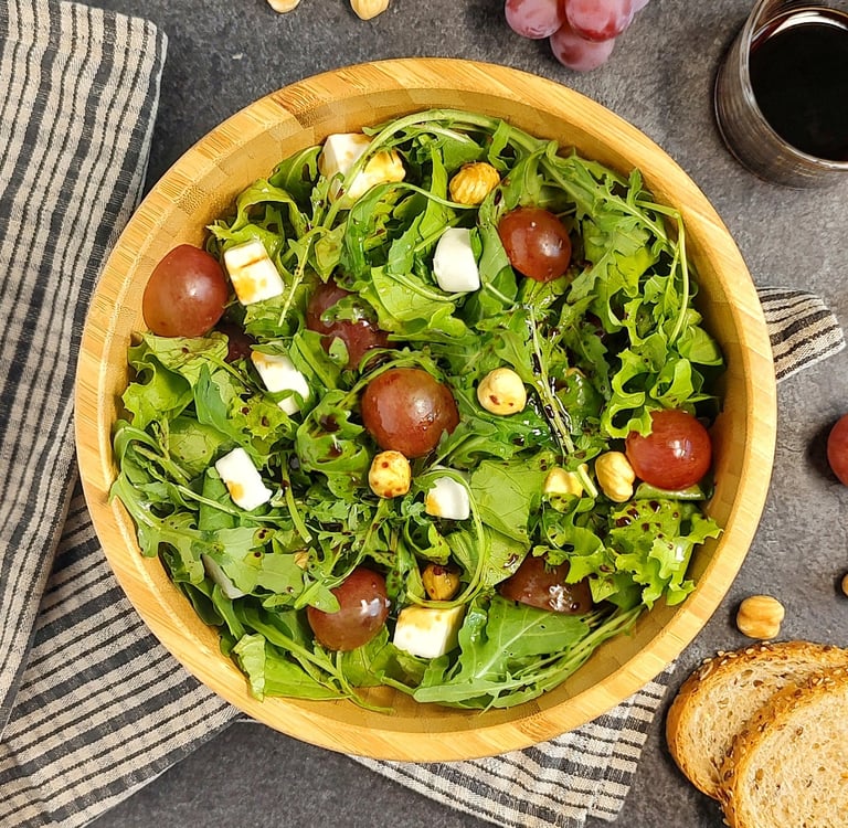 La dolcezza della lattuga gentile e dell’uva rossa, l’amarognolo della rucola, la morbidezza della feta vegetale e la croccantezza delle nocciole… il tutto arricchito da un condimento con OLIO, SALSA DI SOIA e ACETO BALSAMICO, al quale potresti aggiungere anche un po’ di sciroppo d’acero.
